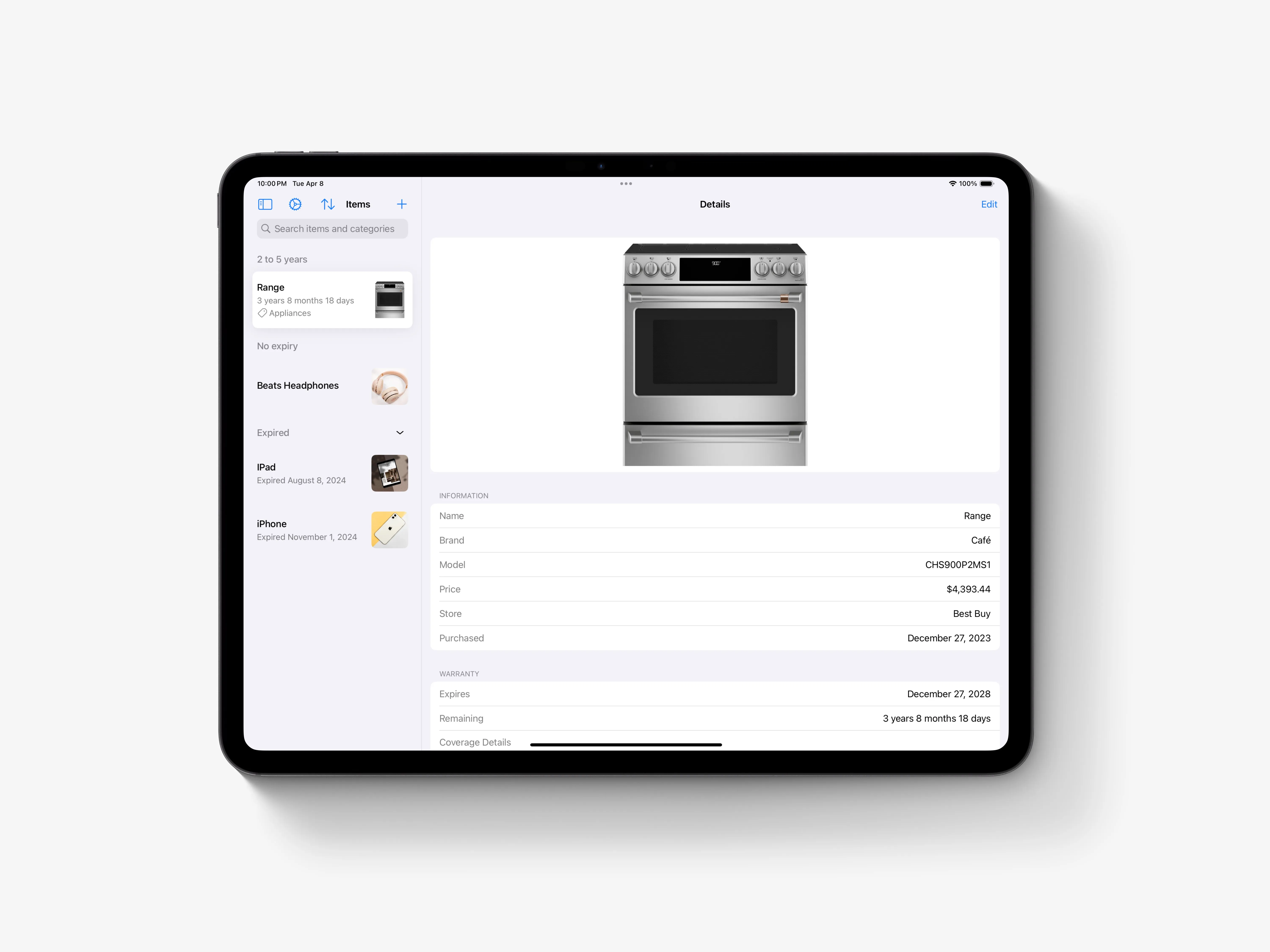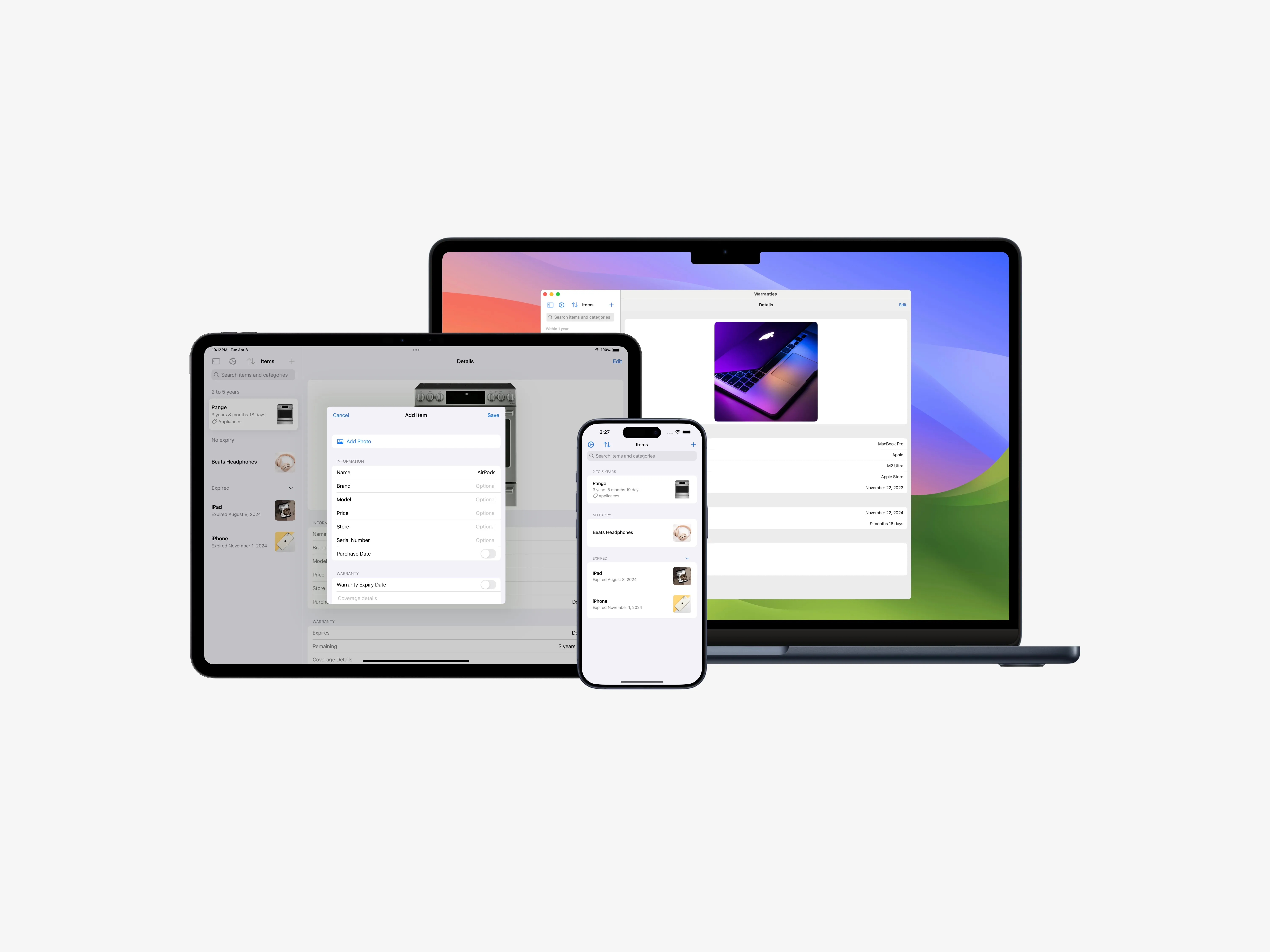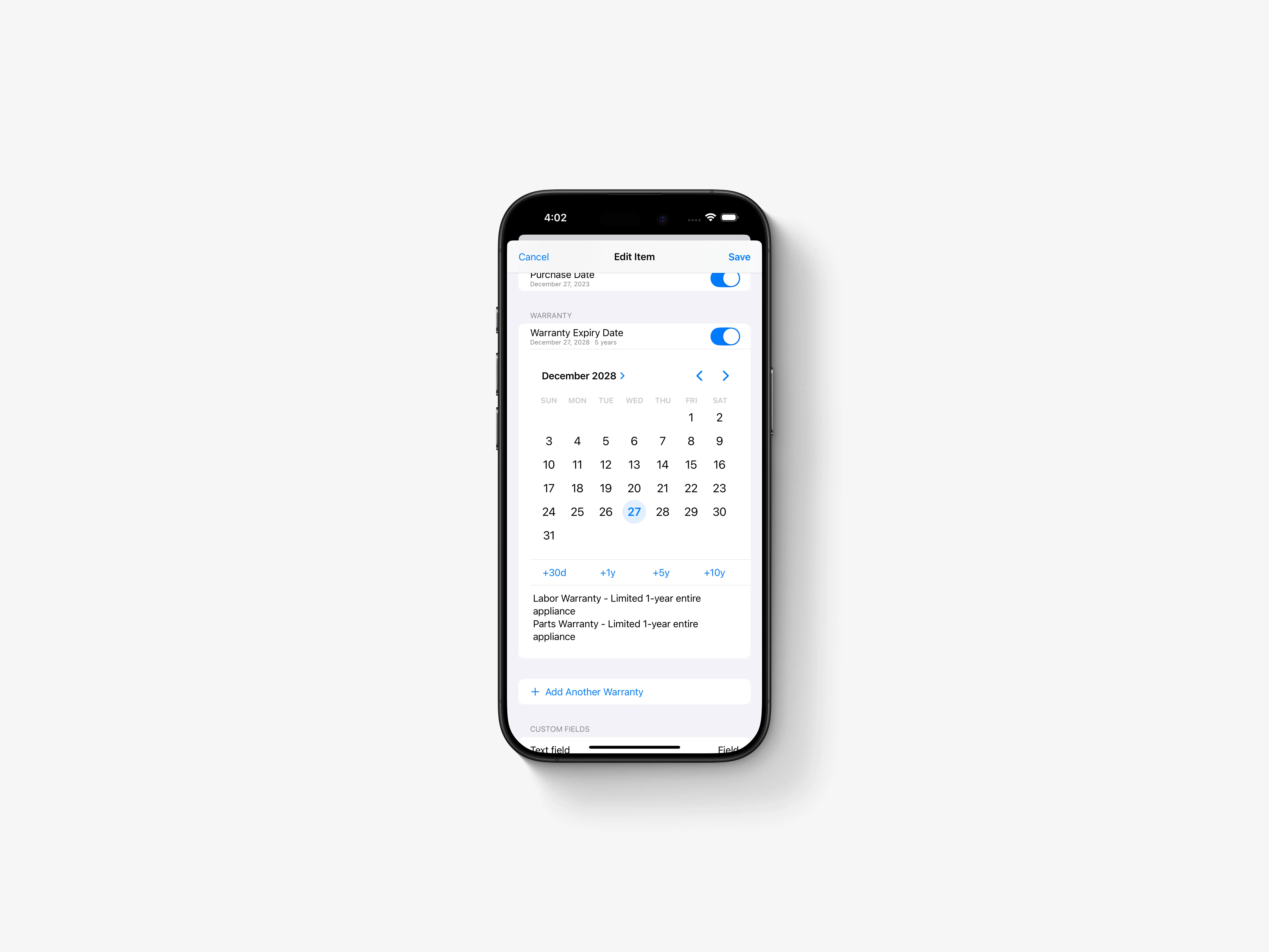 Warranties showcases my expertise in iOS app development and design. This self-created app transforms warranty management, offering features like real-time notifications, a clean interface, and comprehensive document management.